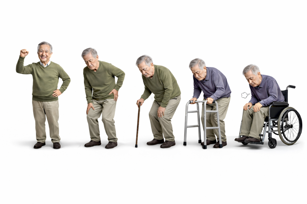 加齢や運動不足によって筋肉量が減少し、転倒や寝たきりのリスクが高まる、いわゆるフレイル状態に近づいていきます。
