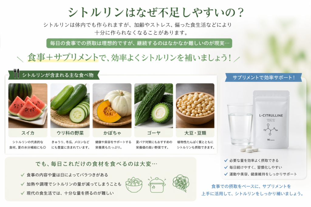 シトルリンは食品にも含まれていますが、日常的な食事だけで十分量を摂るのは簡単ではありません。